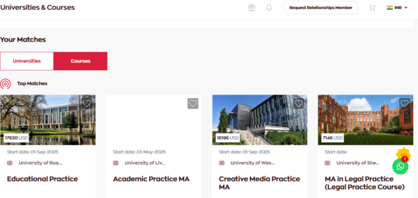 Once your profile is complete, search for universities, courses or your interests in the Universities tab. You will get all the information you need in one page. You can simultaneously look at multiple universities, compare and get information on where your peers are applying, all within the same page.